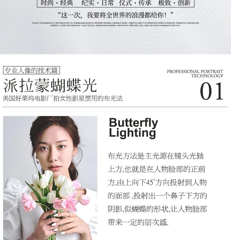 北京婚纱摄影排名布光方法是主光源在镜头光轴上方, 北京婚纱摄影工作室也就是在人物脸部的正前方,北京高端婚纱摄影由.上向下45方向投射到人物的面部,投射出一一个鼻子下方的阴影,北京婚纱照似蝴蝶的形状,让人物脸部带来一-定的层次感