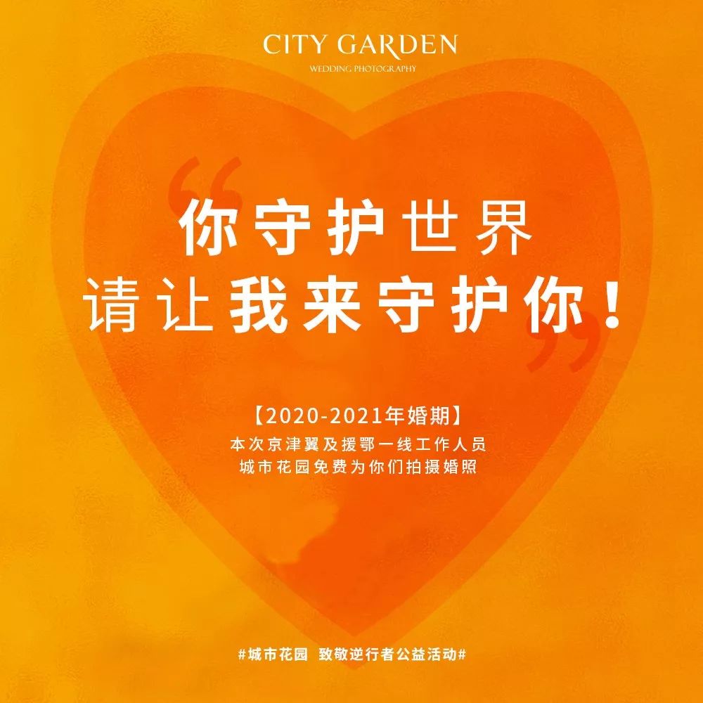 只要是京津冀及援鄂的一线工作人员城市花园免费为你们拍摄婚照,请让我们为你们进一些绵薄之力。