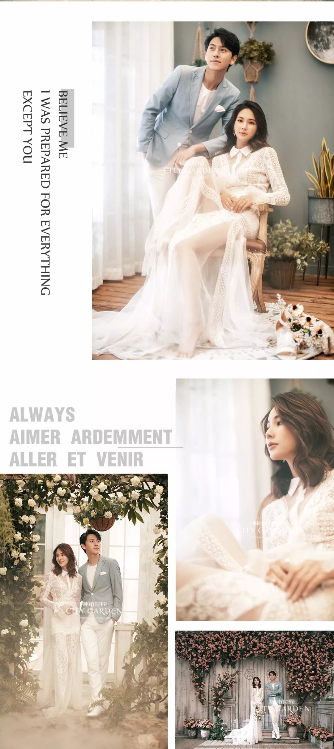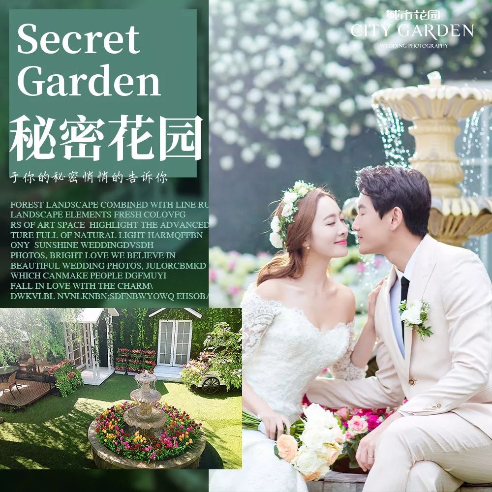 • 城市花园提醒您:决定您的婚纱照前,一定要亲临婚照拍摄现场!看到您能拍的场景环境、摸到您能穿的礼服,再决定,才不会后悔。 • 根据统计有95%的结婚新人,亲临「城市花园•婚纱影城」免费体验婚纱照拍摄过程之后,都选择了城市花园!
