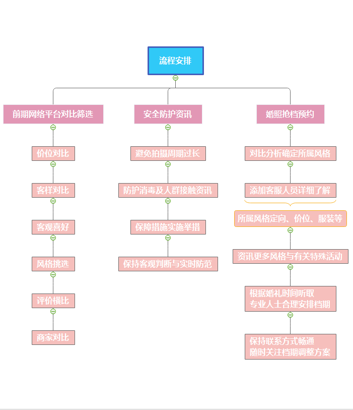 根据疫情状况,我们应该尽量避免人群接触,所以在时间的安排上应该尽量向后延期,当然考虑到很多不可更改的因素存在,无法更改婚期,建议大家选择消毒措施严格、安全防范较强的影楼,时在同婚照流程处理迅速的商家,婚照拍摄时间推迟到婚期前一个月左右联系商家,尽最大可能避免与过多人接触。